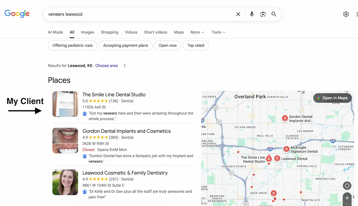 Request Ranking Diagnosis →The Smile Line Studio wanted to rank for high-value cosmetic searches in Leawood, KS. Days after taking over from the previous agency, we started making SEO updates. Within weeks, their practice claimed the #1 spot for key searches, capturing new patients from this high-converting free traffic.
